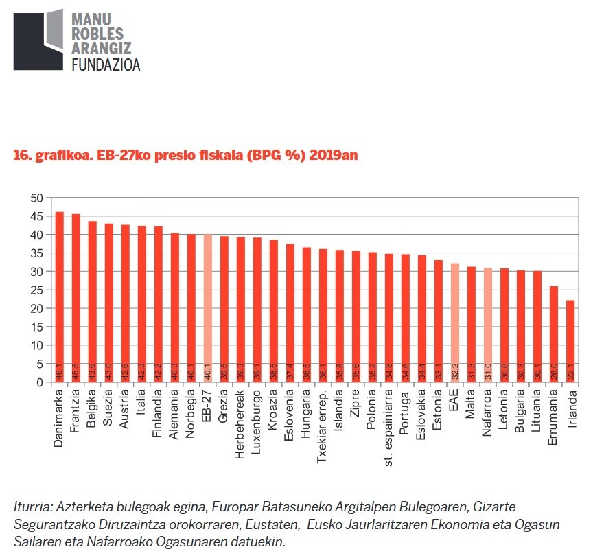 Hobe litzateke Eusko Jaurlaritzak Madrilera baino Europako beste herrialde batzuetara begiratuko balu. Izan ere, Europako presio fiskalaren batez bestekoa, hau da, zerga-sarrerek ekonomian duten pisua, BPGren % 6 handiagoa da EAEn baino. Ideia bat izateko, EAEn Europako batez besteko presio fiskala bagenu, urtean 6.000 milioi gehiagoko diru-sarrerak izango genituzke, Eusko Jaurlaritzak 2022rako aurkeztu duen aurrekontuaren erdia. Urtero. Agian gurea ez da Madrilena bezain txikia, baina Europako herrialde gehienek baino txikiagoa daukagu.