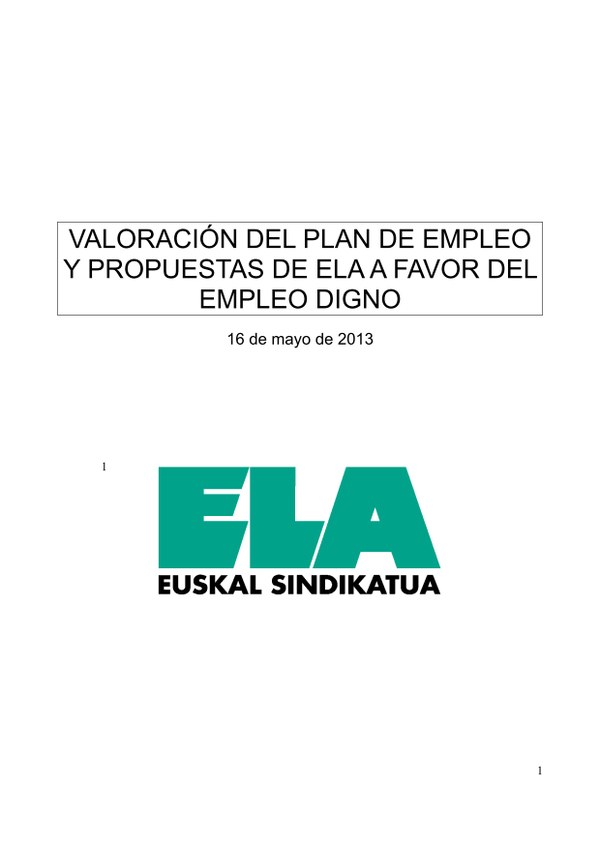 VALORACION DEL PLAN DE EMPLEO Y PROPUESTAS DE ELA A FAVOR DEL EMPLEO DIGNO