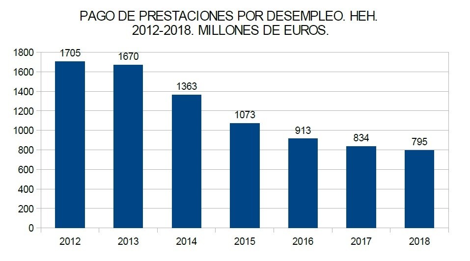 En 2018 en Hego Euskal Herria se han destinado 795 millones de euros al pago de las prestaciones por desempleo (contributiva, asistencial y cotizaciones sociales incluidas). Son 39 millones de euros menos que el año anterior (834 millones).
