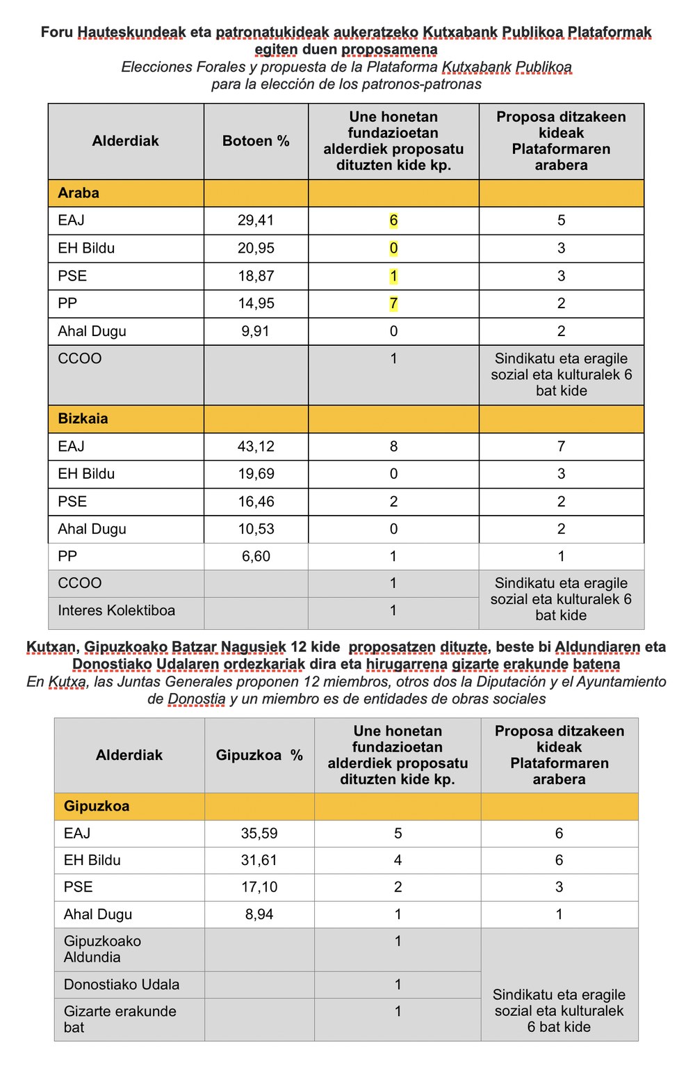 Por eso la Plataforma Kutxabank Publikoa solicita a la sociedad, a las fundaciones y a los partidos que vayamos hacia un modelo democrático al igual que en otras entidades publicas y como mínimo, como se hace en la Fundación Kutxa.