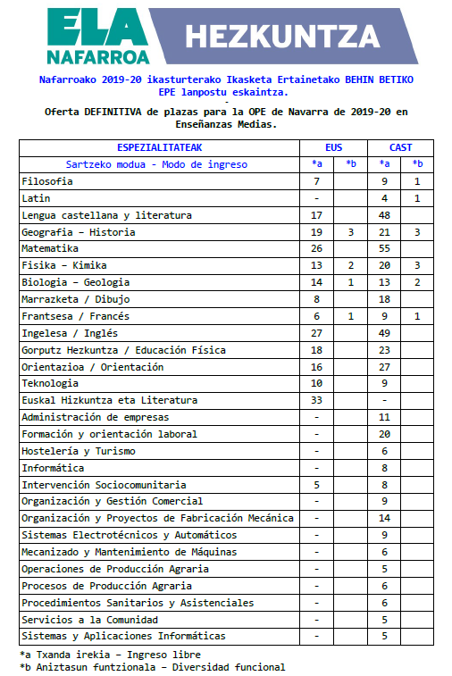 Las plazas presentadas por el Departamento de Educación de Navarra para la OPE de enseñanzas medias en 2020 son de nuevo insuficientes
