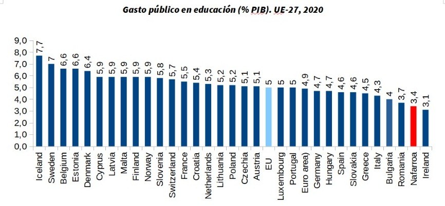 Para comprender la escasa inversión que se destina en Navarra a la educación, es necesario compararla con otros países europeos. Para ello utilizaremos los últimos datos disponibles de Eurostat, del año 2020. El peso de educación sobre el PIB en Navarra fue del 3,4%, mientras que la media europea fue del 5%. La inversión sólo fue inferior en Irlanda. En otros países, como Francia, se situó en el 5,5%; en Bélgica, en el 6,6%; e Islandia, en el 7,7%. Por lo tanto, en Navarra la partida presupuestaria de educación es muy inferior respecto al resto de Europa.
