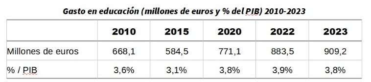 El presupuesto del Departamento de Educación, que incluye el de las universidades, ascenderá en 2023 a 909,2 millones de euros, 25,7 millones más que el crédito definitivo de 2022, lo que supone un incremento del 2,9%.