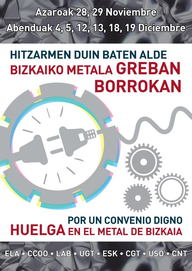 El sector del Metal de Bizkaia se está movilizando desde el pasado mes de mayo, y hasta la fecha ha realizado 10 días de huelga. Se añaden ahora otras ocho jornadas más, previstas para el 28 y 29 de noviembre, y 4, 5, 12, 13, 18 y 19 de diciembre. Remarcan que se trata de una lucha con unos objetivos muy concretos.