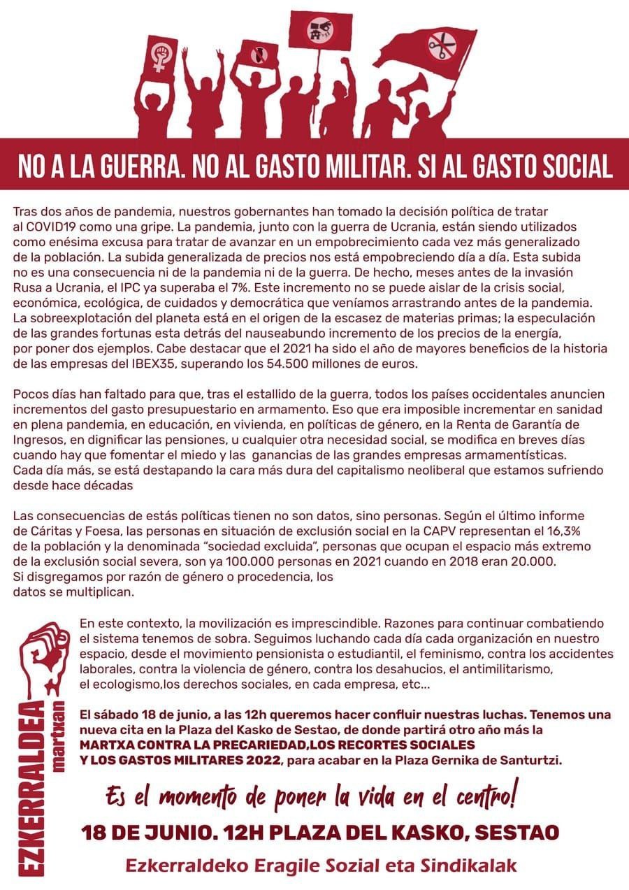 vimientos sociales y sindicales de la margen izquierda -entre los que se encuentra ELA- llaman a participar en la marcha contra la precariedad, los recortes sociales y los gastos militares que tendrá lugar el 18 de junio. La marcha, que partirá de la Plaza del Kasko de Sestao y finalizará en la Plaza Gernika de Santurtzi, pretende denunciar, entre otras cuestiones, la subida generalizada de los precios y el gasto militar, en un momento en que la población está cada vez más empobrecida. Abogan por aumentar el gasto social y recuerdan que el 2021 ha sido el año con mayores beneficios de la historia de las empresas del IBEX35, con cifran que superan los 54.000 millones de euros.