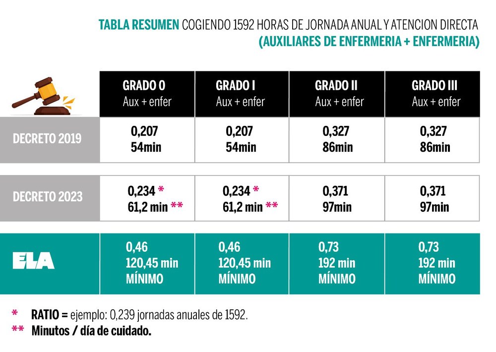 Además, el decreto plantea únicamente una mejora de siete minutos en la atención directa en los grados de dependencia 0 y 1, pasando de 54 a 61 minutos en 24 horas. En los grados 2 y 3 (muy mayoritarios en las residencias) pasa de 86 a 97 minutos; lejos del mínimo de dos horas por residente en los grados 0 y 1 y de tres horas en los grados 2 y 3 que ELA considera necesarias para poder ofrecer y prestar una atención adecuada. Incluso la ratio del Gobierno Vasco es peor que la actual de Gipuzkoa: este borrador supone una ratio inferior hasta en un 24% al ratio existente en Gipuzkoa desde hace 17 años. En el caso de Araba, donde todavía se aplica el convenio estatal con 1.792 horas, cuando se consiga un convenio con 35 horas (1.592 horas), habrá un descenso de un 12% en ratios y atención.