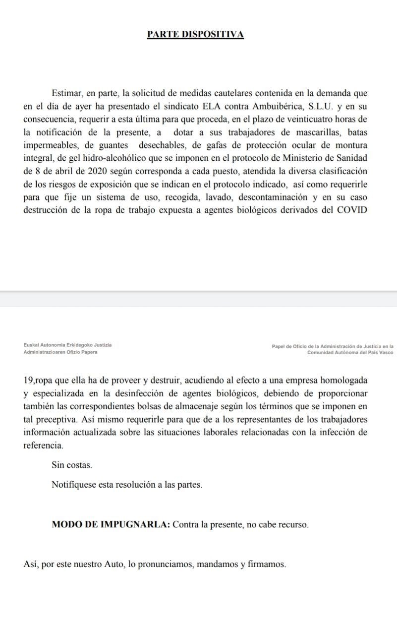 El 14 de abril ELA registró una demanda contra Ambuibérica en materia de tutela de derechos fundamentales (derecho a la salud, vida e integridad física) en la Sala de lo Social del Tribunal Superior de Justicia del País Vasco. Asimismo, el sindicato solicitó medidas cautelarísimas para que las direcciones provean de manera urgente e inmediata a toda la plantilla de EPIs homologados y cumpla con los protocolos de seguridad, con los requerimientos de la Inspección de Trabajo y con las recomendaciones de Osalan. En la demanda el sindicato solicitaba, además, que por cada día que no se garantice la salud de los trabajadores y trabajadoras se imponga una multa. El Tribunal Superior de Justicia del País Vasco da ahora la razón a ELA y condena a Ambuibérica por vulnerar el derecho a la salud y la vida de la plantilla