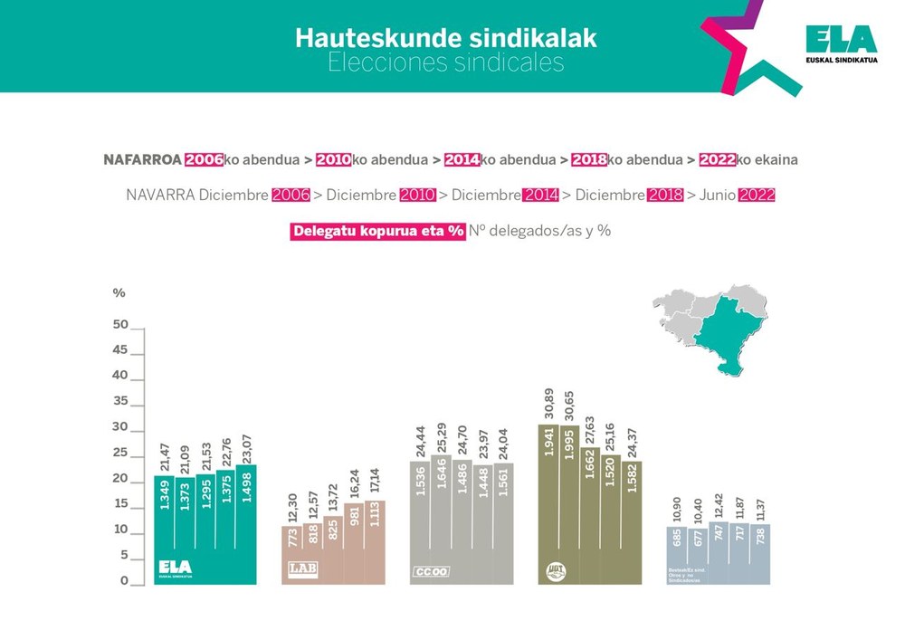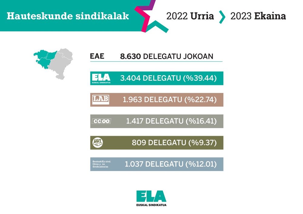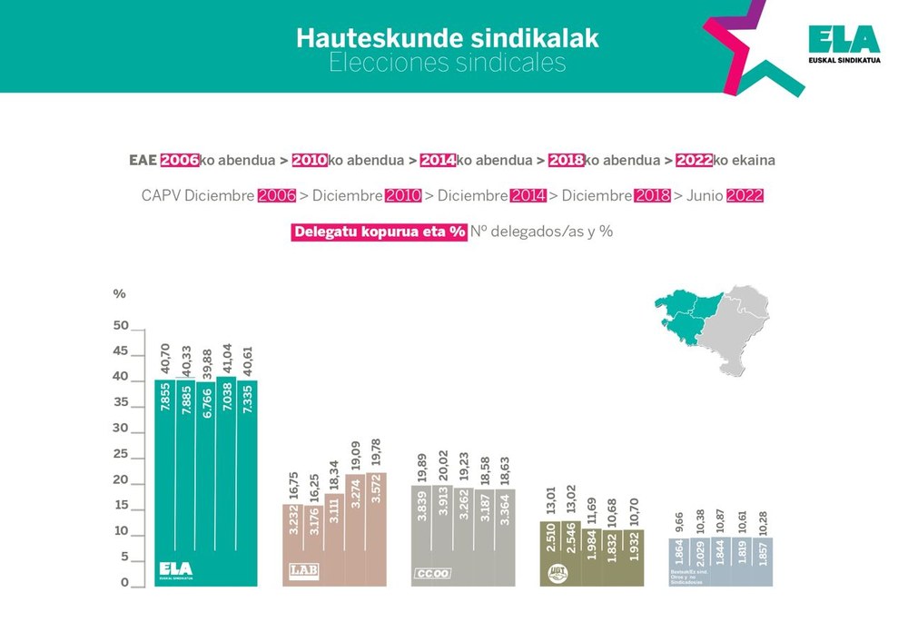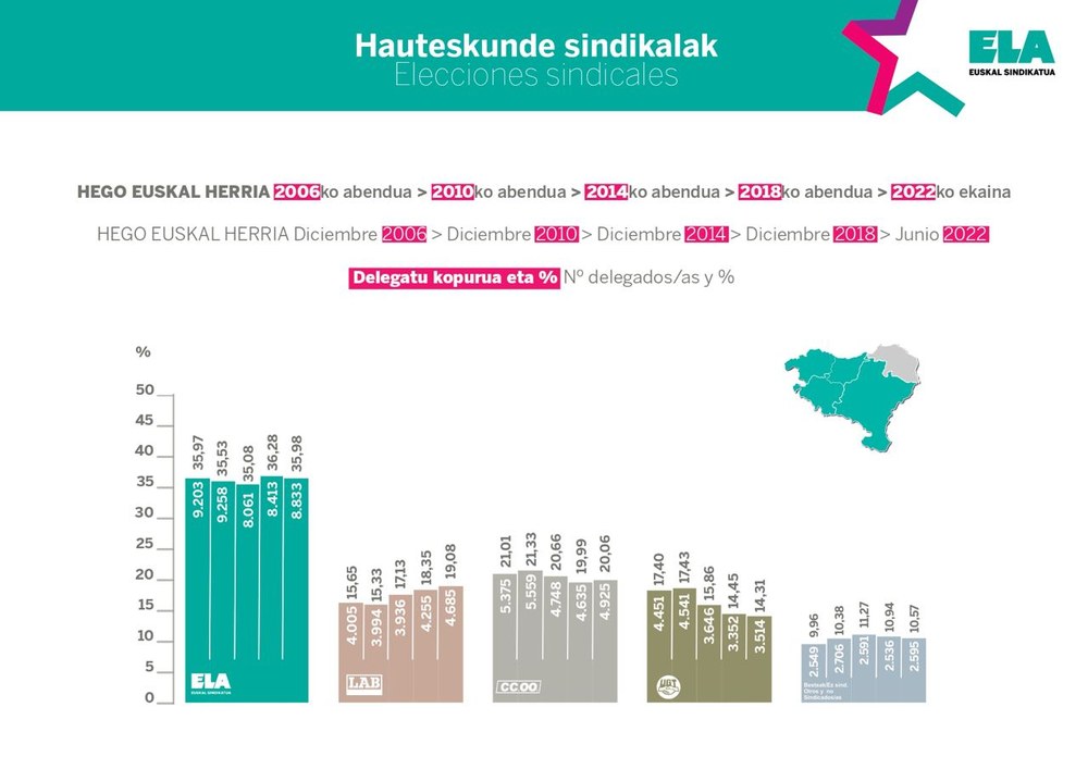 ELA ha presentado la campaña para el nuevo periodo concentrado de elecciones sindicales (2022-23), al que acude con un 36% de representación en Hego Euskal Herria, lo que le otorga una enorme diferencia sobre el resto de organizaciones (casi dobla al siguiente sindicato). En estos próximos nueve meses (octubre-junio), ELA trabajará con el objetivo de ampliar esa ventaja y consolidarse aún más como el sindicato en el que confían la inmensa mayoría de las decenas de miles de personas asalariadas en la CAPV (40,61%) y Navarra (23,07%).