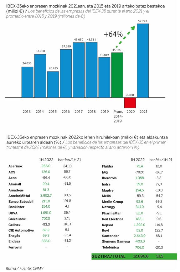 Sin embargo, pese a la complicada situación económica, a pesar de la guerra de Ucrania, las empresas han continuado aumentando sus beneficios en el primer trimestre de 2022. Empresas eléctricas y energéticas han trasladado sin ningún remordimiento el aumento de los costes al precio final. En lo que respecta al sector bancario, la subida de los tipos de interés está provocando un aumento considerable de su negocio. Como se puede ver en la imagen, las empresas del IBEX-35 han incrementado sus beneficios en más de un 50% en el primer trimestre del año 2022 en comparación con el mismo periodo del año anterior. También empresas como Kutxabank, CAF, Dominion o Tubacex han incrementado sus beneficios sustancialmente. Mientras, la clase trabajadora, esa que deriva la mayor parte de su renta al consumo, ve como los precios de los productos básicos, electricidad o gas aumenta, abocándolos a la pobreza.