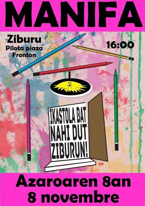 Horregatik, auzi honi irtenbidea eman, Iparraldean ikastolak sufritzen ari diren jazarpena salatu eta Ikastolei ziurtasuna eta egonkortasuna emango dien irtenbidea aldarrikatzeko azaroaren 8an 16:00etan Ziburuko pilota lekutik abiatuta egingo den manifestazioan parte hartzera dei egiten die ELAK bere militante eta afiliatuei.
