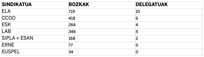 CCOO izan da bigarren sindikatu bozkatuena, ELAk baino %58 bozka gutxiagorekin. Honen ostean, gertu, LAB. Eta atzetik, ESK, SIPLA + ESAN, ErNE eta Euspel izan dira. Atzoko bozken zenbaketa eta horrek emandako delegatu kopurua ikus daiteke beheko taulan.
