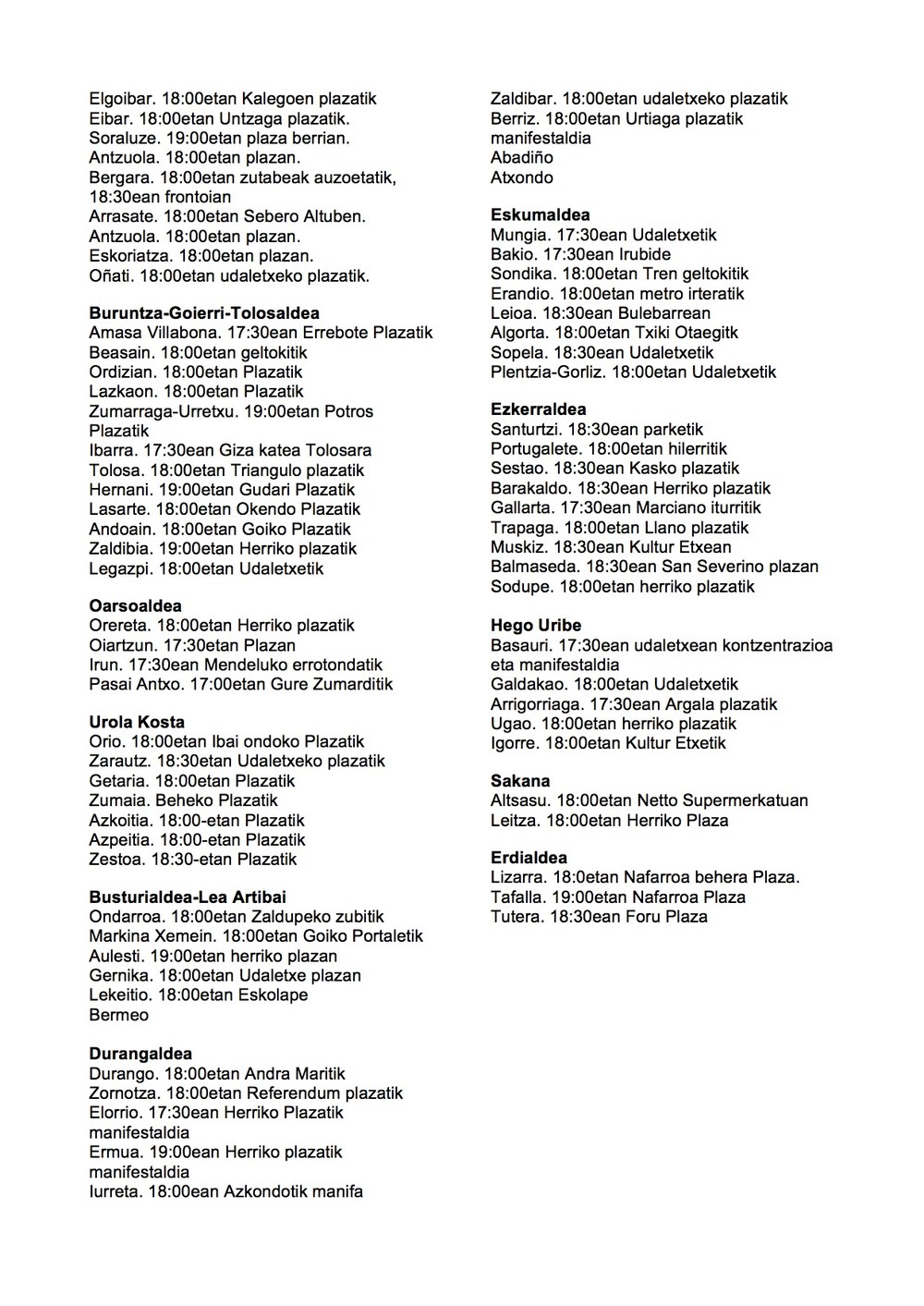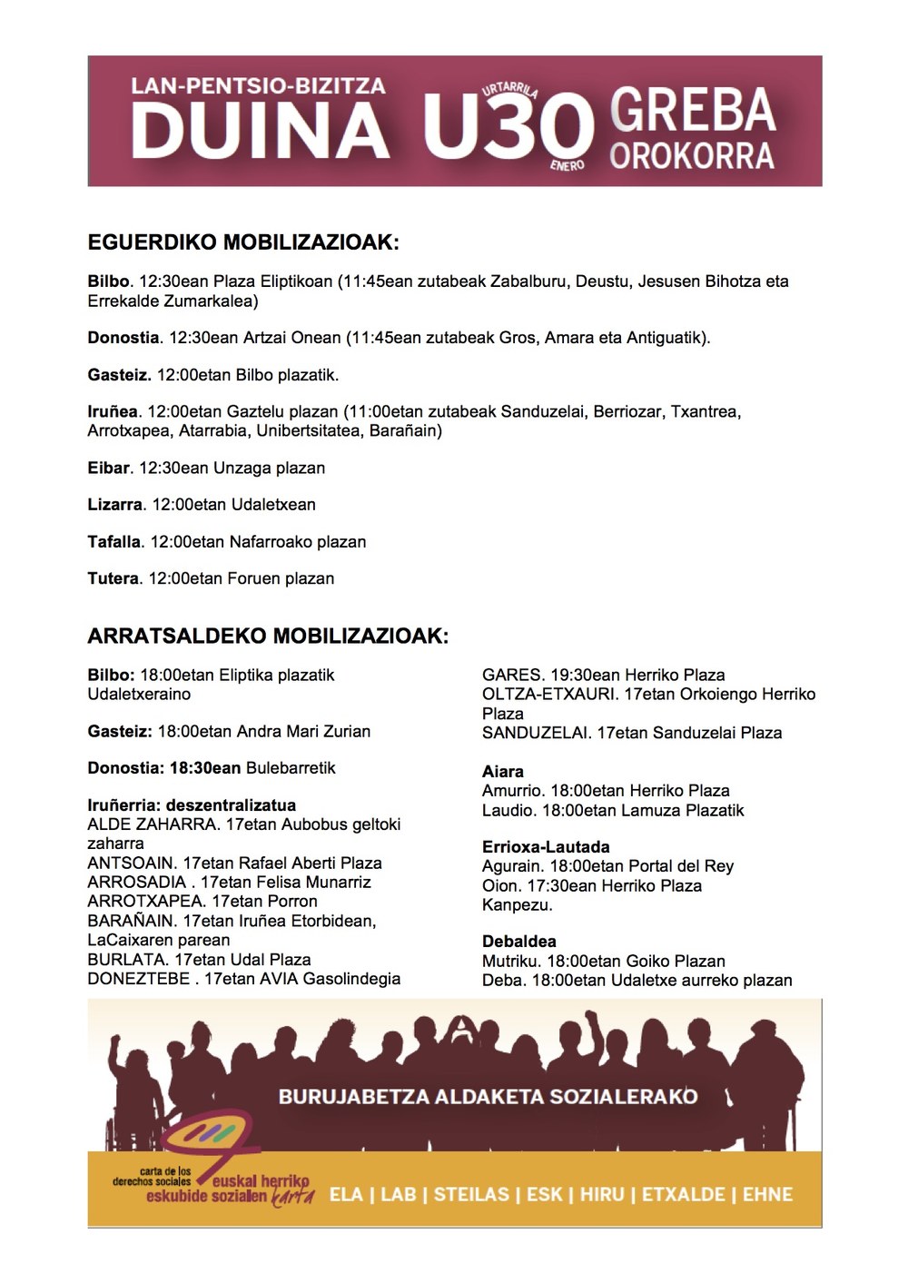 - Goizez, beste lau manifestazio nagusi izanen dira, Karta Sozialak deituta: Eibarren (12.30etan, Unzaga plazan), Tuteran (Foru plazan, 12etan), Lizarran (Udaletxean, 12etan) eta Tafallan (Nafarroako plaza, 12etan).