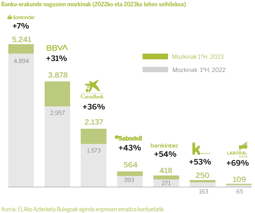2022 errekorreko urtea izan bazen, 2023ko lehen seihilekoan irabaziak are handiagoak izan dira iazko aldi berekoak baino. Ibex-35eko bankuek (Unicajak izan ezik) 12.500 milioi euro baino gehiago lortu dituzte 6 hilabetean. Kutxabankek eta Laboral Kutxak ere iazkoak baino askoz emaitza hobeak izan dituzte, %53ko eta %69ko mozkinen igoerarekin hurrenez hurren. Bloomberg ekonomian espezializatutako hedabidearen arabera, Espainiako banku handiek 40 handituko dute beren interes-marjina.