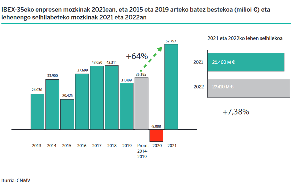 Hori gutxi balitz, 2022ko lehen seihilekoan enpresa horien irabaziak % 7,8 hobetu dira aurreko urteko lehen seihilekoaren aldean. Guztira, 29.161 milioi euro urtarriletik ekainera, enpresa horiek 2019 osoan lortutako etekinetatik gertu (31.500 milioi euro).