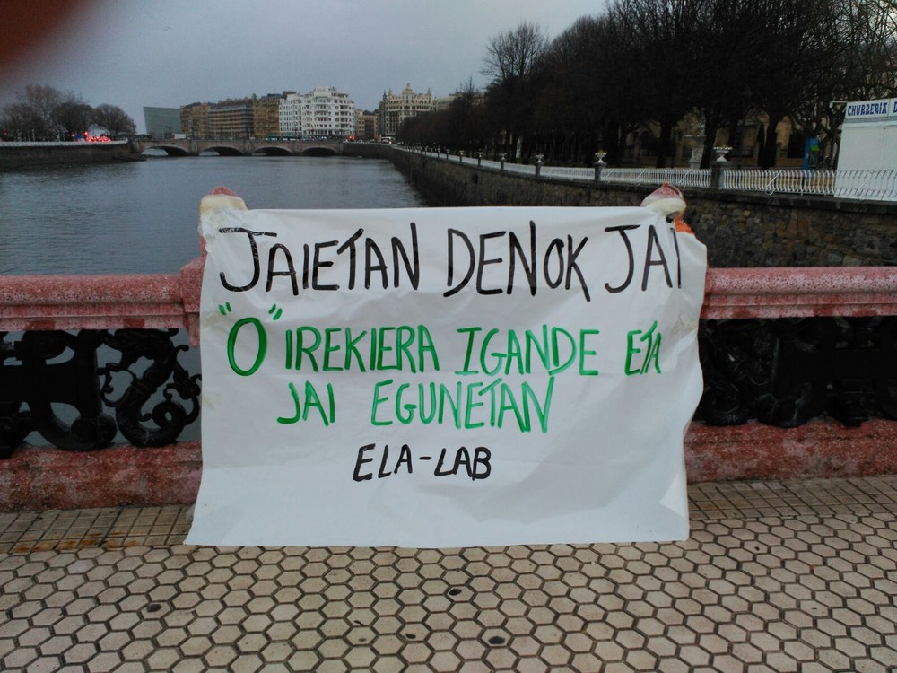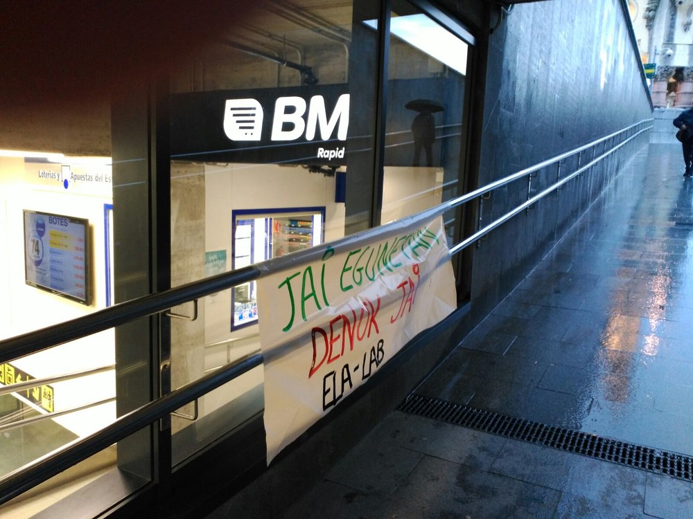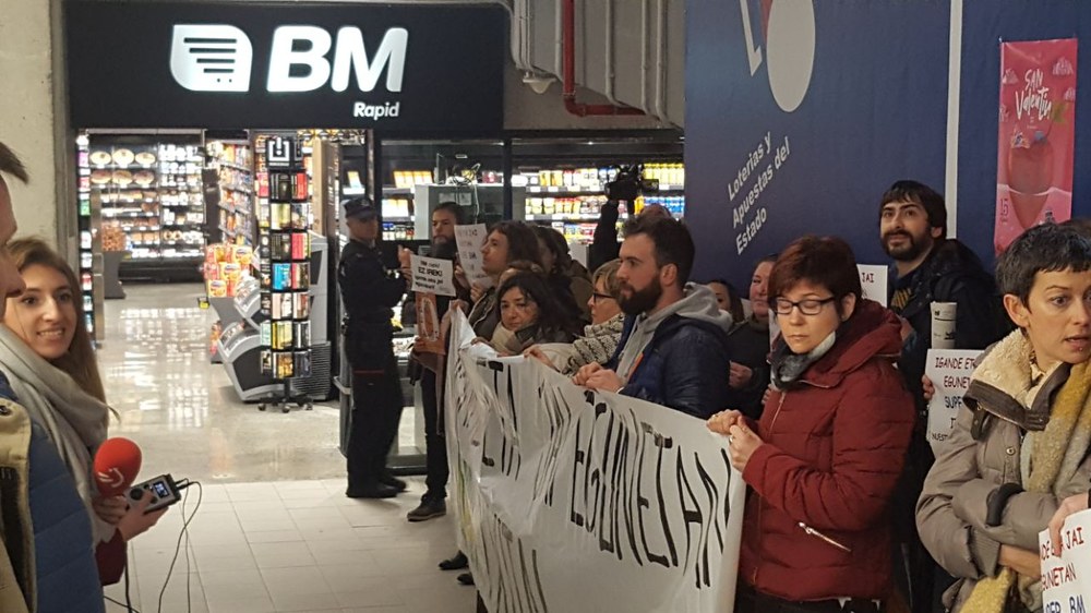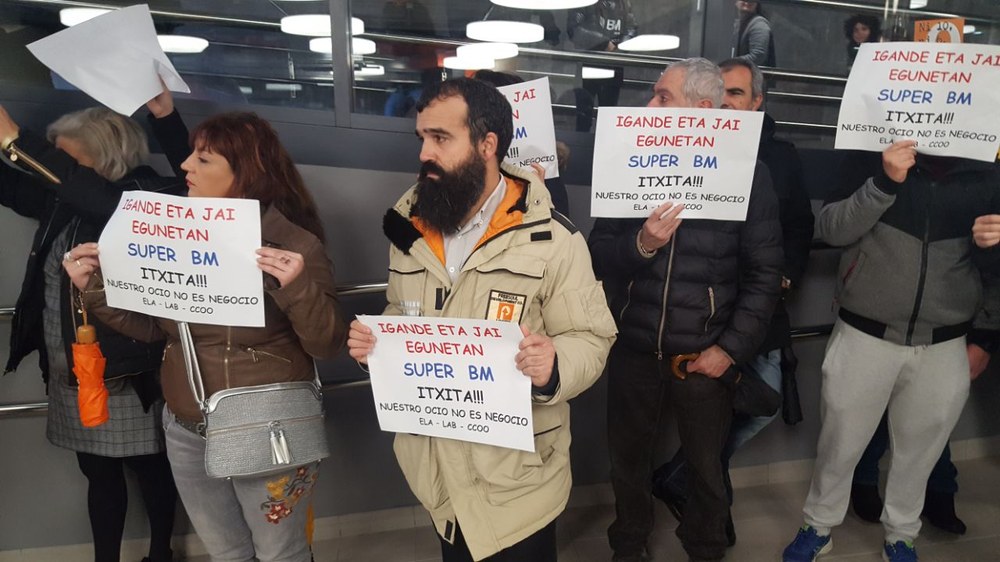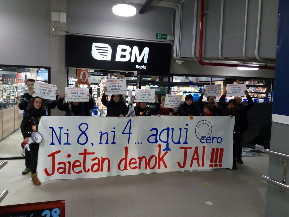 Aste honetan Donostiako autobus geltokian zabaldu den BM supermekatuak igande eta jai egun guztietan zabaltzeko asmoa du. Igande eta jai egunak atsedenerako egunak dira; senideekin eta lagunekin egoteko egunak. Igande eta jai egunetan zabaltzeak merkataritza txikiari kalte egiten dio, ez du enplegu gehiago sortzen, eta langileen kontziliazioa zailtzen du. Behin eta berriz multinazional handiak saiatzen ari dira, gezurrak zabalduz, dendak asteko zazpi egunetan zabaltzen. Guk jarraituko dugu "Hemen zero!" aldarrikatzen. Gaur, BMk zabaldu duen lehen igandea, ELA, LAB eta CCOOk elkarretaratzea egin dugu autobus geltokiko supermerkatu aurrean.