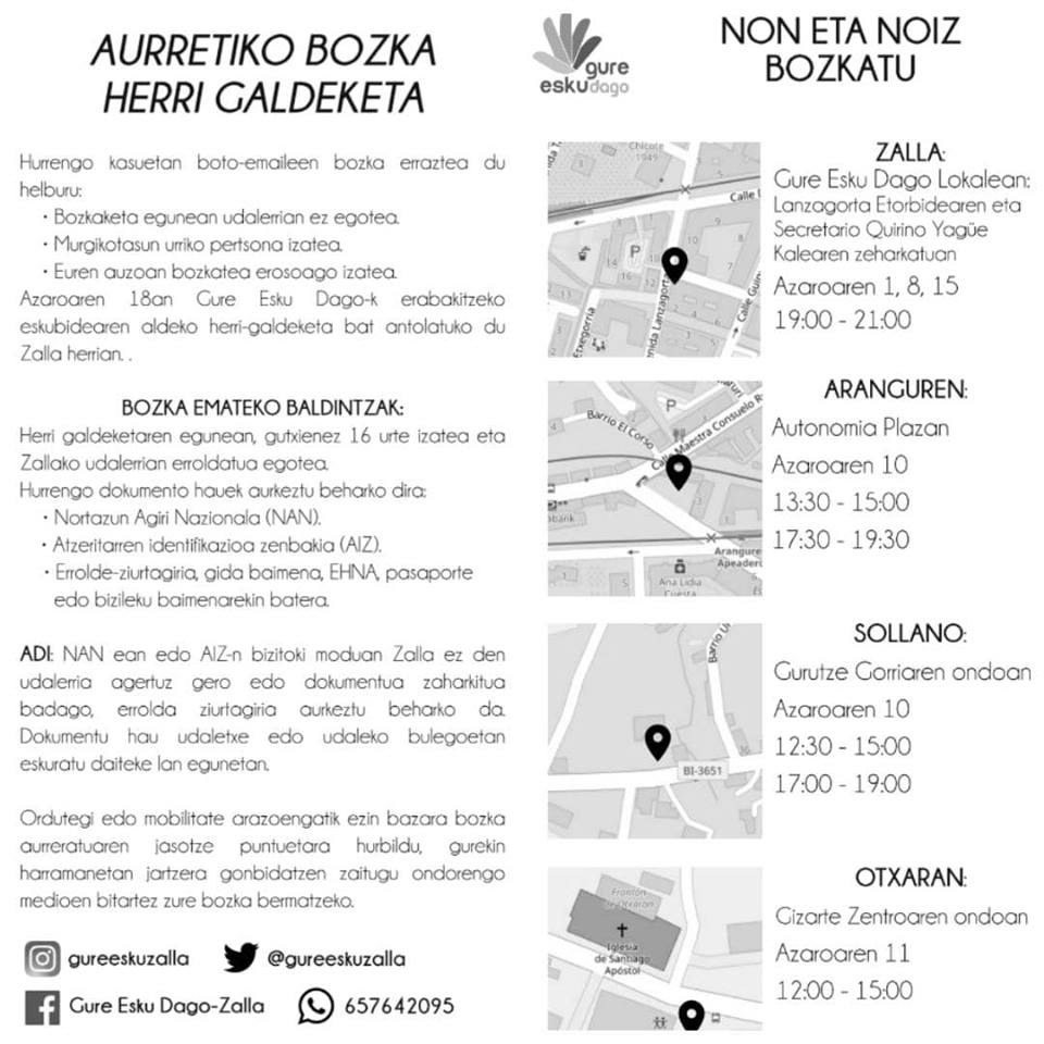 Zallako Gure Esku Dago-ren batzordeak bultzatuta, honako galderarekin galdeketa egingo da azaroaren 18an: “Nahi duzu euskal herritarrok burujabea izatea gure etorkizun politiko, ekonomiko, sozial eta kulturala erabakitzeko?”.