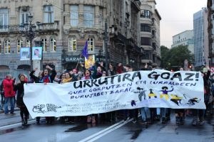Eguerdian Etxaldeko emakumeek ekoitzitako produktuekin prestatutako bazkaria izan dugu. Eta bazkaloste musikatu baten ostean, Las Kapritxosas antzerki taldeak eraman gaitu manifestaziora. “Urrutira goaz, gure gorputzen eta lurraldeen burujabetzara” lemapean, eta noski, euripean, Bilboko kaleetan barrena ibili gara: autodefentsa feminista aldarrikatu, hiri ereduak eragiten duen zapalkuntza salatu, emakume migratuen eskubideak defendatu eta emakume antifaxistei aitortza bat ere egin diegu. Gaur egun Zara enpresak erosi duen eraikina emakume antifaxisten egoitza zen 1937an. Sua piztu dugu euren omenez eta eskuz egindako plakatxo bat jarri horman. Metro batzuk aurrerago ikusi genituen argi urdinak ugaritzen. Ertzaintza kotxe bi eta uniformedun gizonak bi neska* gazte identifikatzen, BBVAko leihoetan eserita zeudelako. Ondoan edari kutxa horma bat, Feministon Herrira gonbitea egiten zigun mural handi batekin, kolektiboki eraikitakoa. Leiho horietatik eskegita, patriarkatua irudikatzen duten matxisten irudiak: Kultura patriarkala, eliza, kirol munduko erasotzaileak… Pintura zekarten arrautzez zikinduta amaitu zuten azkenik. Hau ere kolektiboki “zikindu” genuen. Ondoan pankarta bat: “Blanco, burgues, varón, adulto. Neska gazteokin jai daukazu!”.