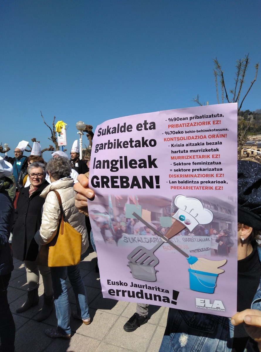 Gaur Eusko Jaurlaritzako Hezkuntza Sailarentzat zuzenean lan egiten duten (pribatizatu gabe geratzen den %10a) ehundaka langilek greba egin eta kalera atera dira berriz ere Jaurlaritzari administrazioaren menpe dagoen sektore feminizatu eta prekarizatuenaren kudeaketa publikoa, kontsolidazio prozesu bat, murrizketei buelta eman, diskriminazioarekin amaitu eta lan baldintzak duintzea exijitzeko, baita pribatizazioa geratzeko ere.