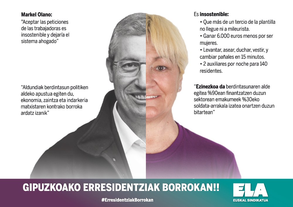 Grebalariek gogora ekarri dituzte Markel Olanok kongresu feminista batean berriki egindako adierazpenak. “Aldundiak berdintasun politiken aldeko apustua egiten du, ekonomia zaintza eta indarkeria matxistaren kontrako borroka ardatz izanik”, baieztatu zuen orduan Diputatuak. Bada, grebalariek gogor salatu dute halako adierazpenak egiten dituen bitartean, langileen oinarrizko aldarrikapenei bizkarra ematea. “Olanok 86.078,72 euro jasoko ditu 2020an, alegia, iaz baino 6.000 euro gehiago, %8 gehiago. Erresidentzietako langileon eskaerak, ordea, onartezinak direla dio, ez direlako ekonomiko sostengarriak sistemarentzat”.
