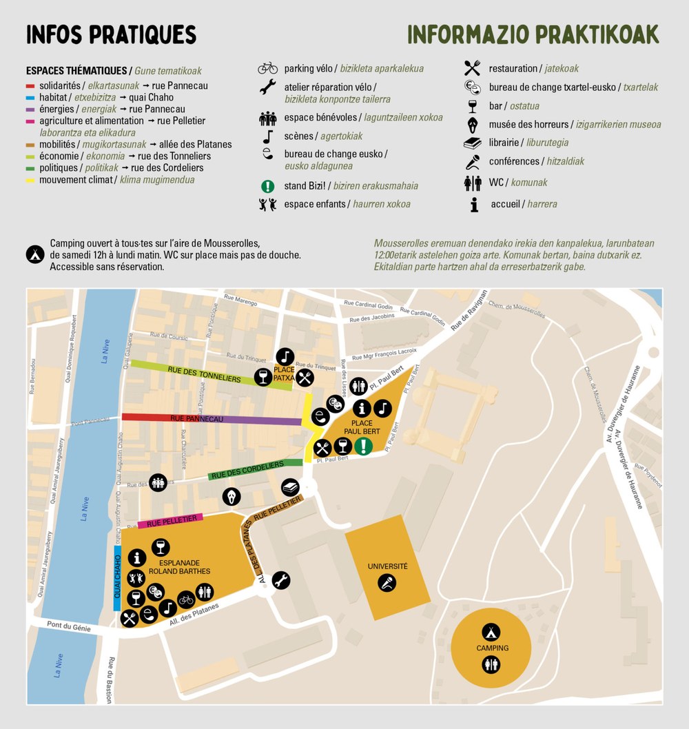 Karrikaz karrika, gazte zein helduek zazpi auzo tematikoetan barrena ibiliz, jarduera ainitz ezagutzeko aukera izango dute: tailerrak, erakusketak, ekitaldiak, erakus mahaiak eta elkarteen edo biztanleen lekukotasunak. Elkartasuna, etxebizitza, energia, laborantza eta elikadura, mugikortasuna, ekonomia eta politikaren inguruan antolatutako auzoak izango dira. Ehun bat egitura eta hizlari izango dira.
