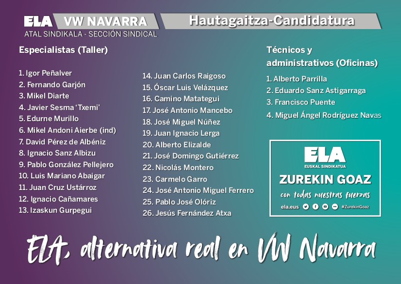 Horren aurrean, ELAk hautagaitza zintzo, langile eta sinesgarria aurkeztu du, espezialisten multzoan (tailerra) zein teknikoan (bulegoak), Igor Peñalver eta Alberto Parrilla lehen postuetan, hurrenez hurren. ELAko hautagaiek azpimarratzen dute “militantziak bahitzen eta bezero sareak sortzen dituzten estrategiak errotik aldatu behar direla. Mundu guztiak promozionatzeko baldintza berdinetan egon behar du, baina kasu horretan orain arteko kaltetuenak emakumeak eta gazteak izan dira; orain, gainera, UGTk, CCOOek eta CCek sinatu nahi duten hitzarmenak abandonaturik utzi dituzte”.