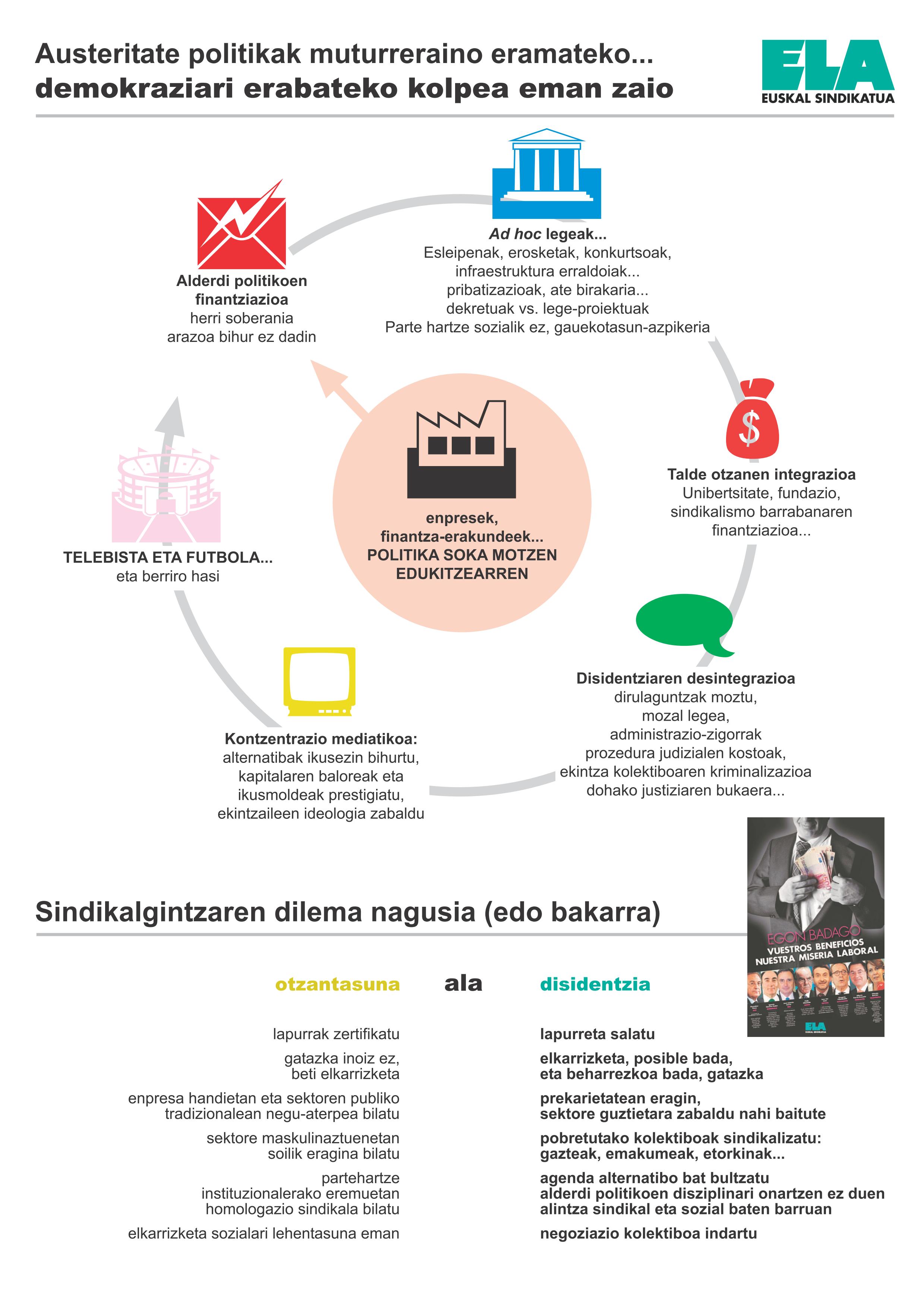 Infografia honetan azaltzen den gisara, azken urteotan demokraziari kolpe latza eman behar izan diote austeritate politikak diseinatu eta aplikatu ahal izateko. Egoera honen aurrean sindikatuak bi aukera ditu: otzantasuna edo disidentzia.